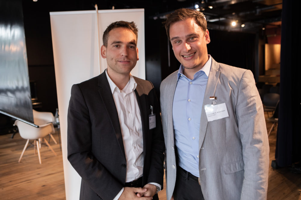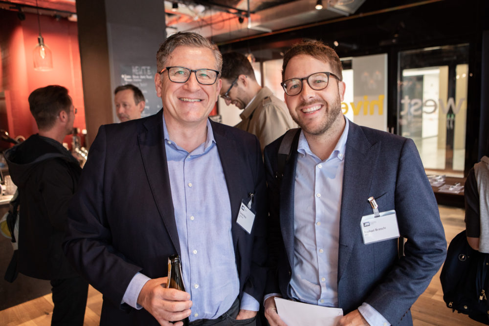 - Daniel Hess (Tamedia) und Raphael Bratschi (Aymo) geniessen den Networkingapéro