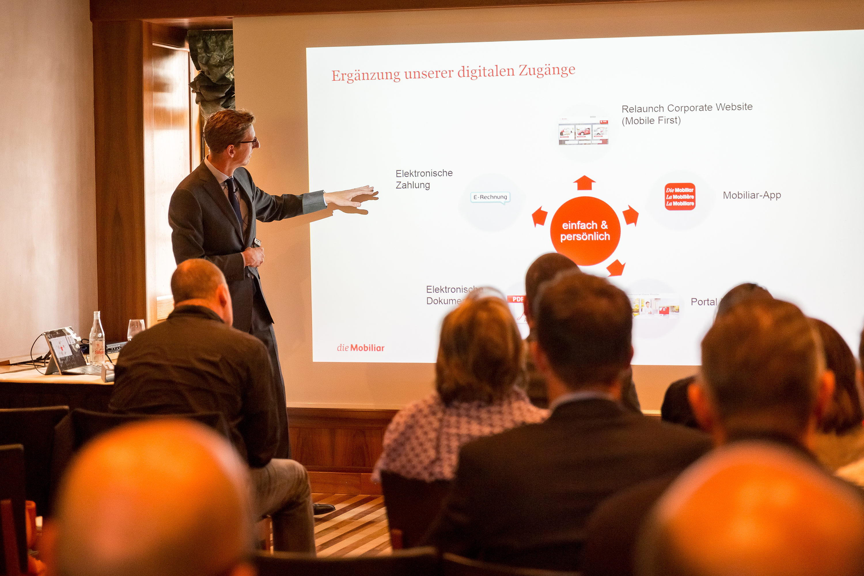 Um von der Offline- in die Online-Welt zu kommen, setzt die Mobiliar auf eine Dualstrategie: das Bewährte wird weiterentwickelt und die digitalen Dienstleistungen werden konstant erweitert. Der Versicherer will ein durchgängiges Kundenerlebnis schaffen, wobei die Qualität vom Service online und offline gleich hoch sein muss. Gicot erklärte, wie wichtig die persönliche Beziehung zwischen dem Versicherungsberater und dem Kunden ist, da die eigentlichen Versicherungsprodukte kopierbar seien. Deshalb sei bei der Mobiliar die physische Präsenz der Agenturen auch in Zukunft elementar für die Costumer-Experience.